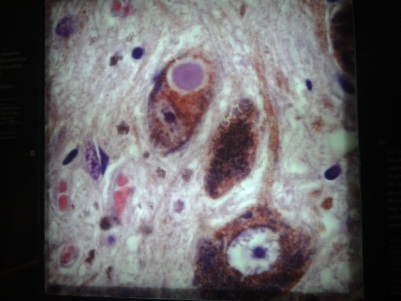 En el pasillo principal hay una serie de fotos que muestran múltiples lesiones en el cerebro humano y ejemplos de lo que le pasaba a este en el cerebro de un ratón. Encontré una placa que decía “El estudio de enfermedades neurodegenerativas como la enfermedad de Parkinson ha revelado los daños que se producen en el tejido nervioso de los pacientes”.